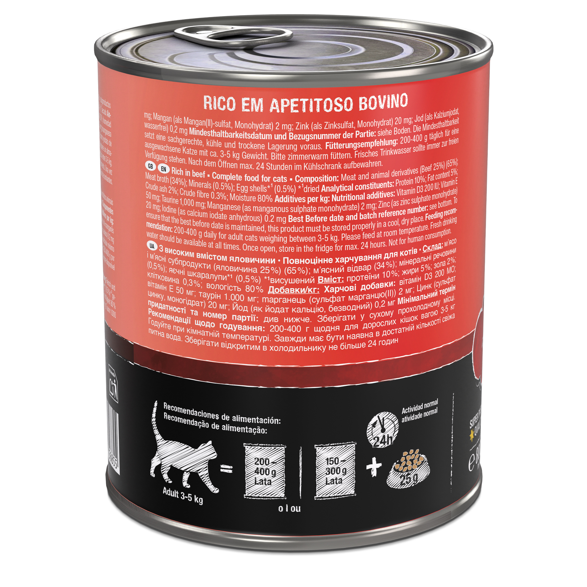 200-400g diarios para gatos entre 3-5 kg. Administrar a temperatura ambiente. Asegúrese de que el animal disponga de agua fresca en todo momento. Una vez abierto, conservar en el frigorífico un máximo de 24 horas.