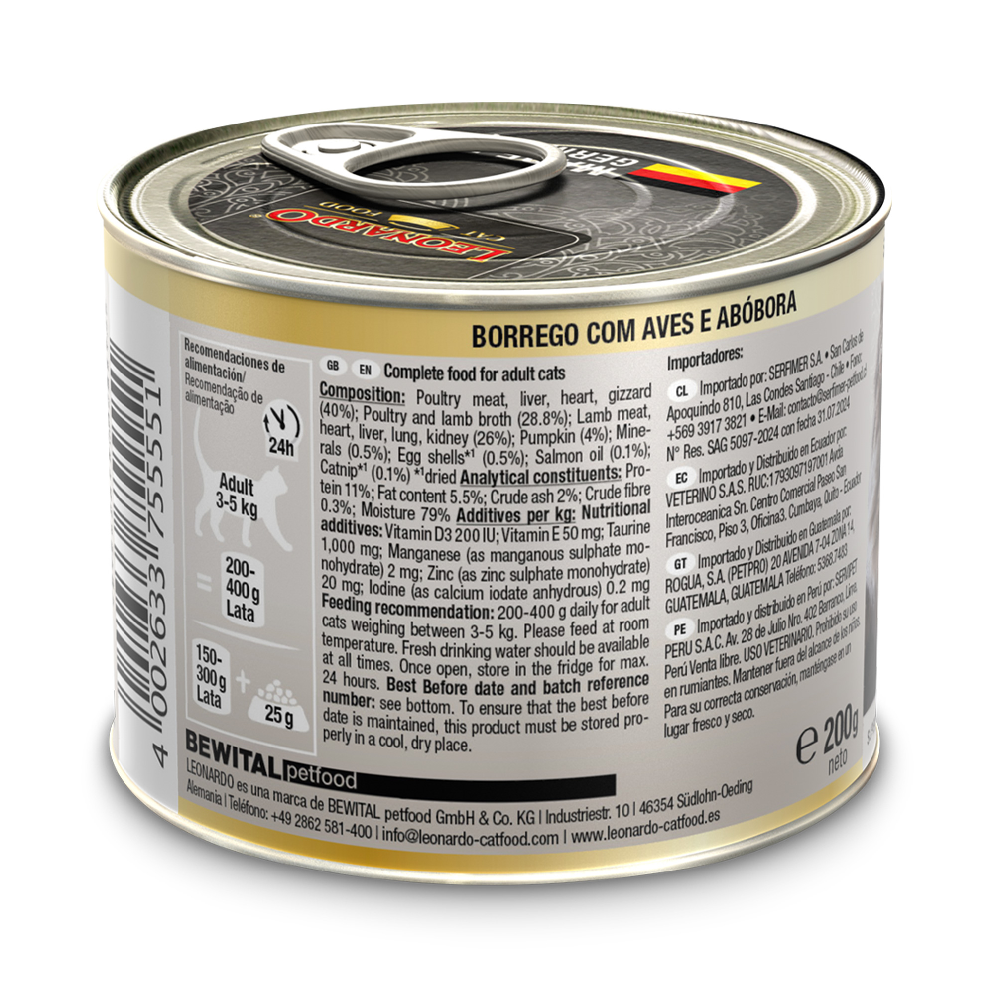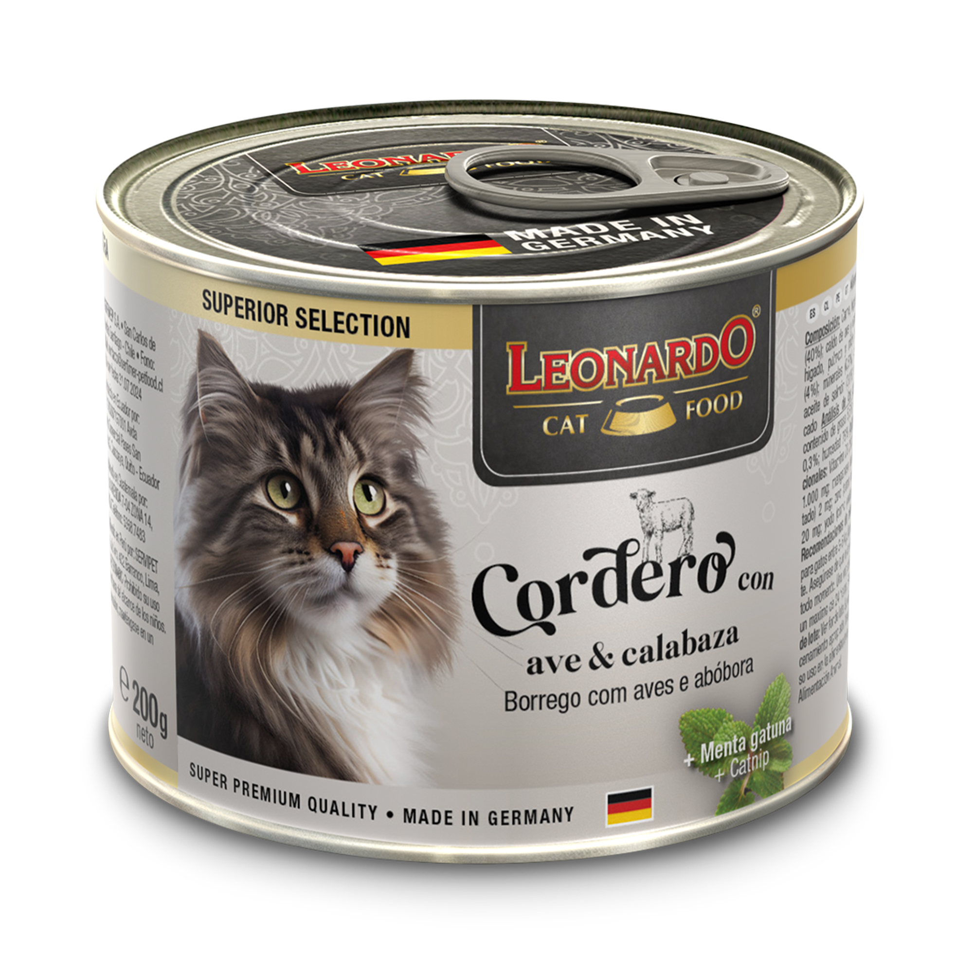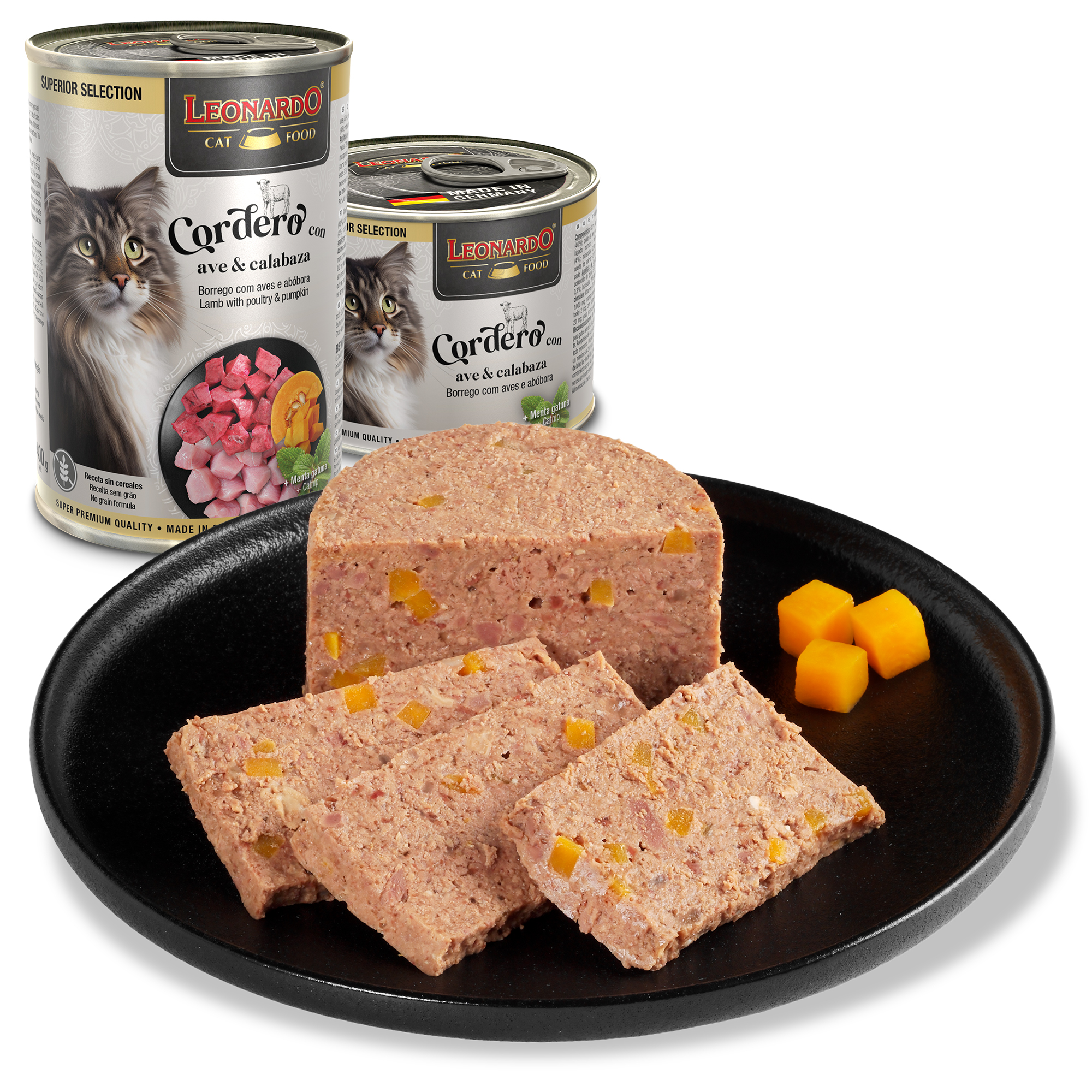No sólo es sabroso en otoño: la combinación de cordero tierno y carne de ave suave y baja en grasas es una golosina especial que también es adecuada para los estómagos sensibles de los gatos. La calabaza suavemente preparada añade un ligero dulzor, así como valiosos nutrientes que tienen un efecto positivo en el bienestar de su pequeño gourmet. El aceite de salmón añadido, con ácidos grasos poliinsaturados, proporciona al pelaje un brillo hermoso y sedoso.